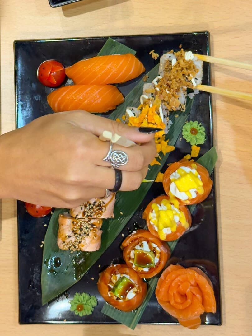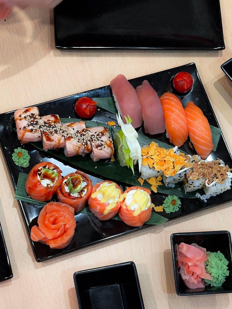 Su carta incluye una variedad muy amplia de opciones: nigiris, sashimis, makis, uramakis, temakis, arroz negro, sushi frito, además de entrantes como gyozas o edamame, postres y bebidas —incluyendo bubble milk teas, fruit teas y granizados. El local apuesta por una cocina versátil que cubre diferentes estilos de alimentación: hay opciones aptas para vegetarianos y veganos, así como platos pensados para quienes prefieren pescado o carne.